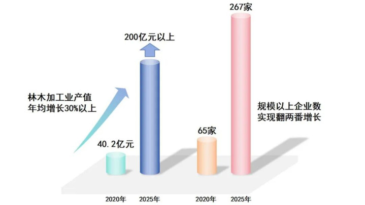 产业规模实现跨越式增长。“十四五”期间,来宾市林木加工产业呈现爆发式增长态势,产值规模连上新台阶。2024年,全市规模以上林木加工业产值达到196.7亿元,较“十三五”末的40.2亿元增长近5倍,年均增速保持在30%以上;预计2025年将顺利突破200亿元大关,在一个五年规划周期内先后实现100亿级、200亿级的关键跨越。企业培育成效显著,截至2025年10月,全市规模以上林木加工企业数量达267家,较“十三五”末的65家实现翻两番增长,形成了大中小企业梯次发展、协同共进的产业生态。
